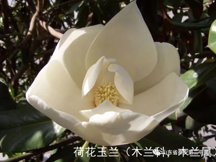 荷花玉兰,木兰科,木兰属。别名广玉兰。常绿乔木,叶长圆状椭圆形,正面深绿色,背面黄绿色,被锈色。花单生于枝顶,花被片9-12,倒卵形。聚合果圆柱状。花期5-6月,果期10月。