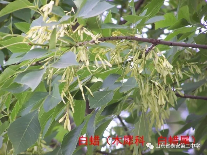 白蜡,木犀科,白蜡属。落叶乔木,叶对生,羽状复叶具小叶5-7,椭圆卵形至广椭圆形。圆锥花序顶生近顶生,雌雄异株,缺花冠。翅果长条形,平展。