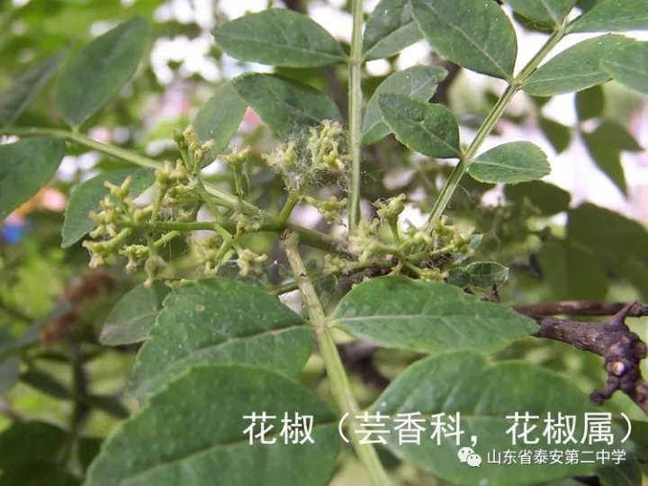 花椒,芸香科,花椒属。落叶灌木或小乔木。奇数羽状复叶互生,小叶5-11,对生,小叶卵形至椭圆状广卵形。聚伞圆锥花序顶生,花单性或杂性同株。果球形,熟时红色至紫红色。果皮味麻,是不可缺少的调料。