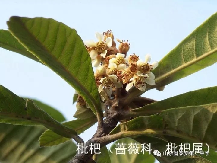 枇杷, 蔷薇科,枇杷属。常绿小乔木。单叶互生,叶革质。花多数组成圆锥花序,花瓣白色,冬季开花,次年初夏果实成熟。果球形或长圆形,黄或桔黄色,可食。“树繁碧玉叶,柯叠黄金丸”, “五月枇杷黄似菊,谁思荔枝同此时”都是对枇杷的描述。