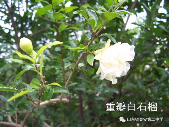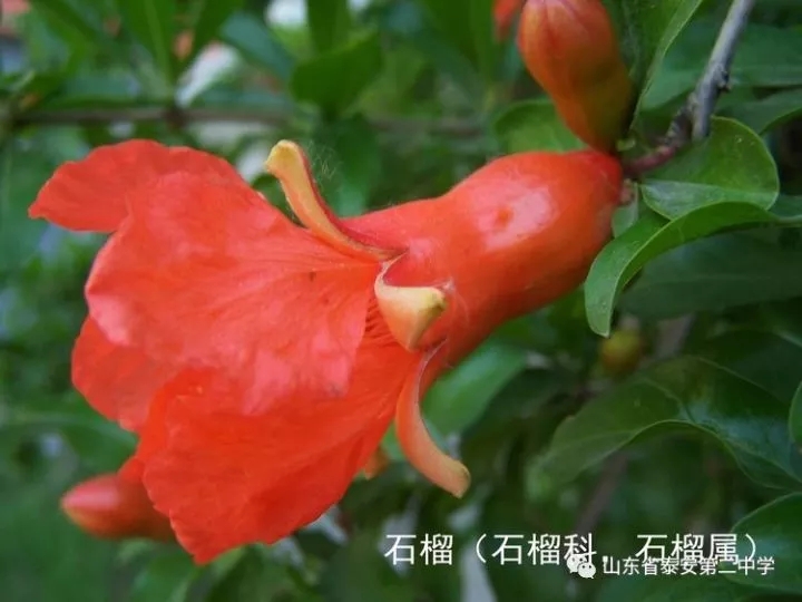石榴,石榴科,石榴属。落叶灌木或小乔木。小枝有角棱。单叶对生。花鲜红色,单生或数朵簇生于枝顶及叶腋,花期夏季。果近球形,大型,有宿存萼。原产中亚,相传为汉代张骞出使西域,从安石国(伊朗一带)引入,古人又名“安石榴”。石榴的果实内籽多。我国传统园林绿化上,喜欢用牡丹、松柏、石榴配置。以示多福、多寿、多子。苏轼诗云“石榴有正色,玉树真虚名”,王安石诗云“万里丛中一点红,动人春色不在多”,都是古人称赞石榴花的佳句。石榴花的颜色除大红外,还有粉红、红色和白色等。